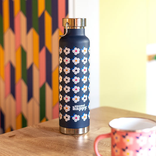 Navy Blue Retro Floral Print Copper Insulated Water Bottle - 650ml