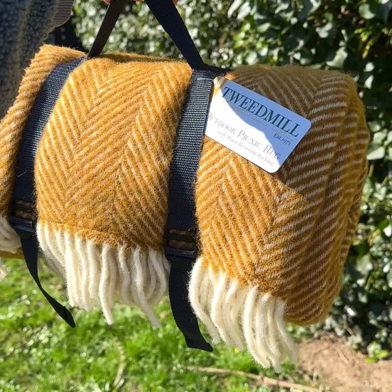 Polo Picnic Rug Blanket English Mustard/Navy Fishbone Weave and Navy Strap